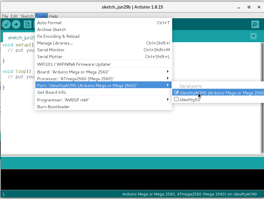 En caso de que sea una tarjeta azul, seleccionaremos el puerto /dev/ttyACM0 .